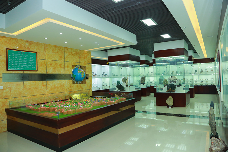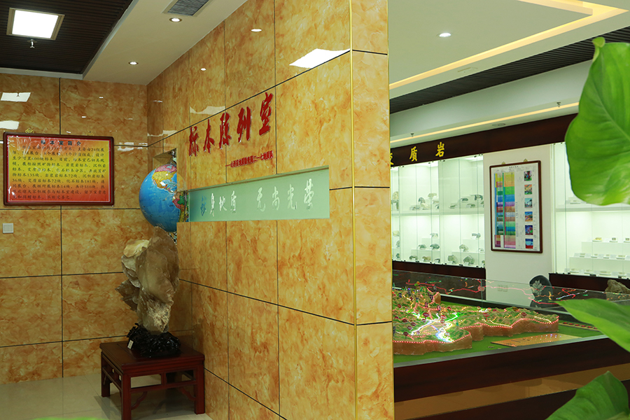 標(biāo)本室面積約135平方米,主要由24組展柜、5組展臺(tái)、8個(gè)展樁、1個(gè)沙盤(pán)組成,設(shè)計(jì)至少可置600塊標(biāo)本。目前,標(biāo)本室已初具規(guī)模,展柜按照礦物標(biāo)本、巖漿巖標(biāo)本、沉積巖標(biāo)本、變質(zhì)巖標(biāo)本、化石標(biāo)本分區(qū),共放置礦物標(biāo)本135塊、巖漿巖標(biāo)本72塊、沉積巖標(biāo)本36塊、變質(zhì)巖標(biāo)本72塊、化石標(biāo)本181塊,連同展臺(tái)、展樁所展標(biāo)本14塊,共計(jì)510塊。